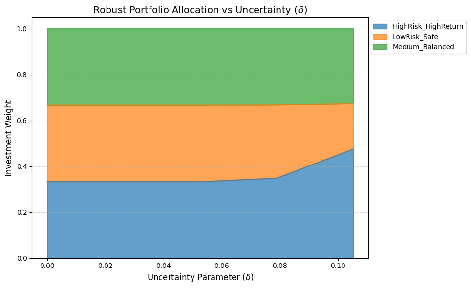 ロバスト性の感度分析:Pythonスクリプトこのコードでは、\(\delta\)(不確実性の円の半径)を 0.0(標準的なモデル)から段階的に増やし、各ポイントでの配分比率を計算します。